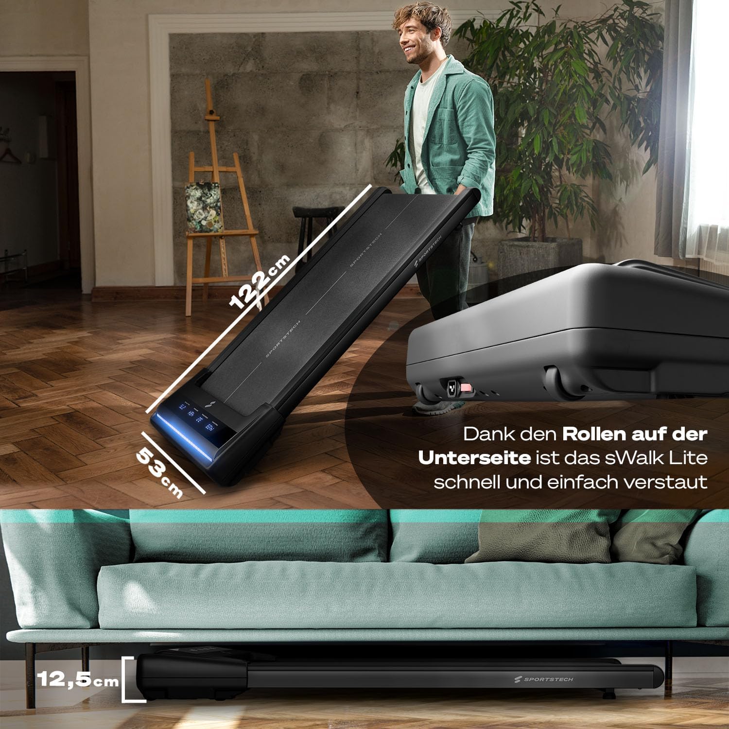 Das Sportstech Laufband sWalk Lite ist optimal fuer zu Hause, mit manueller Steigung, Walking Pad bis 6 km/h und Treadmill bis 12 km/h. Es verfuegt ueber eine App, Fernbedienung, ist kompakt, hat eine LED-Anzeige und ist ideal fuer das Home Office. Mit dem sWalk Lite koennen Sie Ihr Training auf ein neues Level heben und Ihre Fitnessziele erreichen.